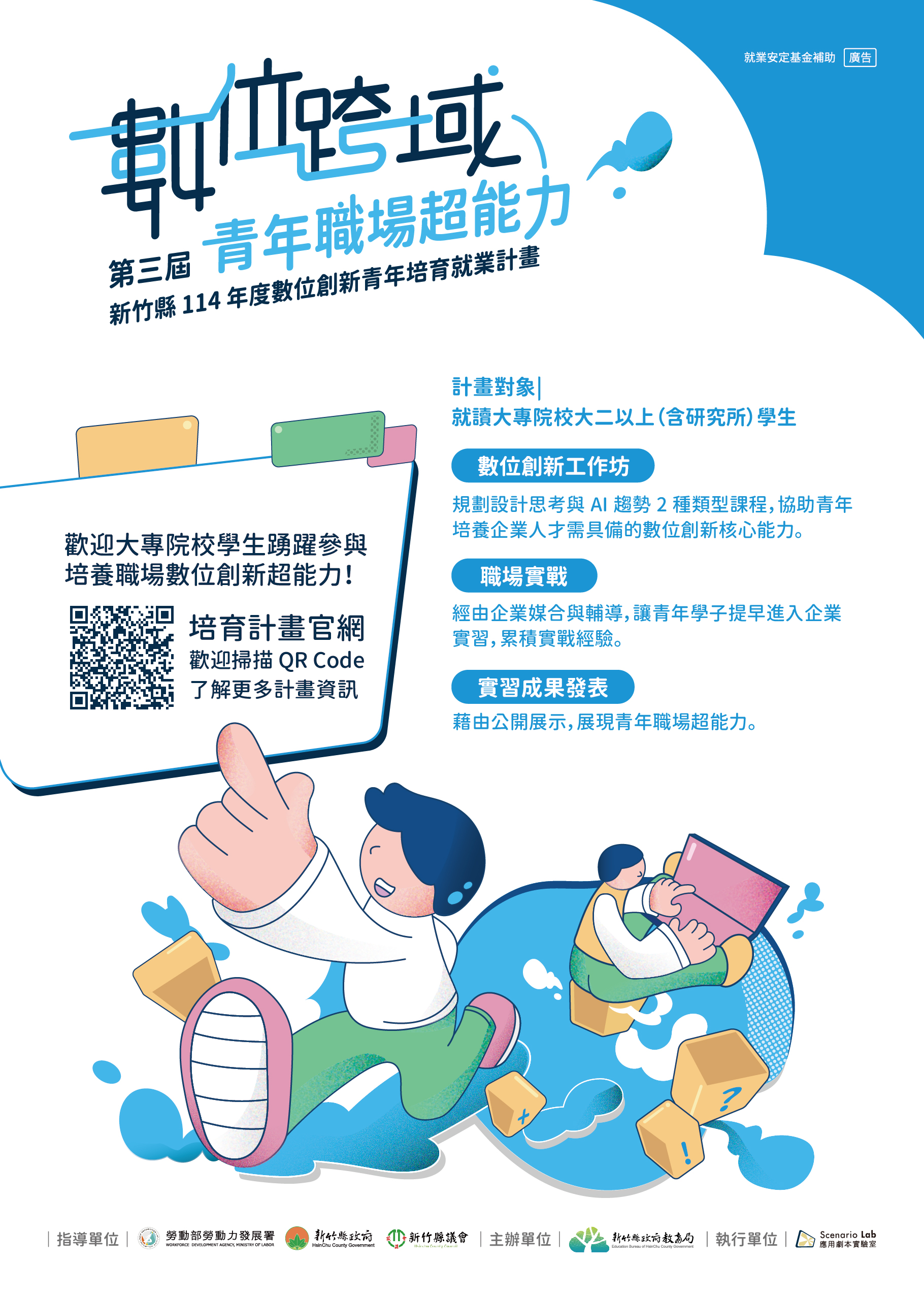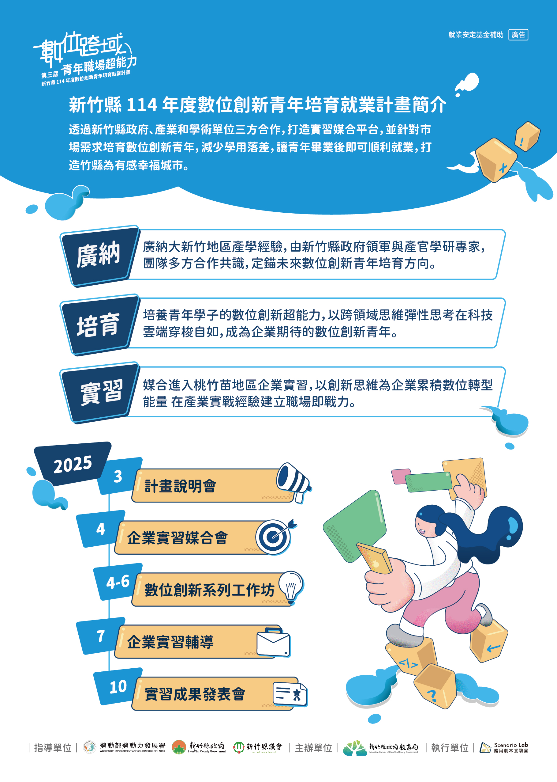 二、計畫內容、報名期程及企業職缺請參考官網:https://sites.google.com/scenariolab.com.tw/digitalyouth。