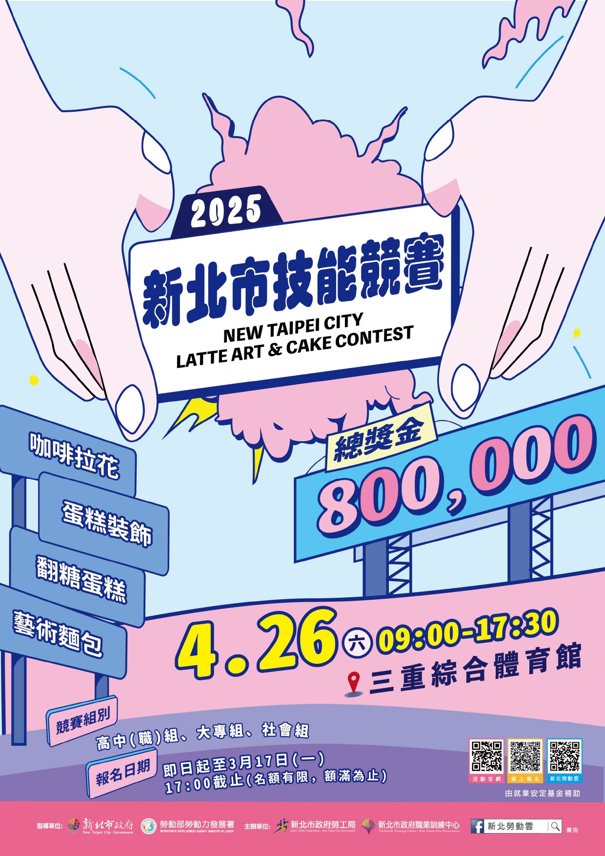 一、新北市政府勞工局為發揚技能價值觀念,推廣職業技能訓練,藉由翻糖蛋糕、奶油蛋糕裝飾、藝術麵包及咖啡拉花做為競賽標的,鼓勵青年學子及相關從業人員參與,吸引大眾的目光及興趣,展現技職教育與職業訓練價值。