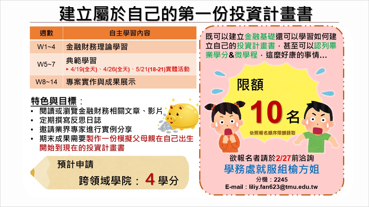 【好康報你知】「建立屬於自己的第一份投資計畫書」自主學習方案招募成員中!!【1132學期限額10名】
