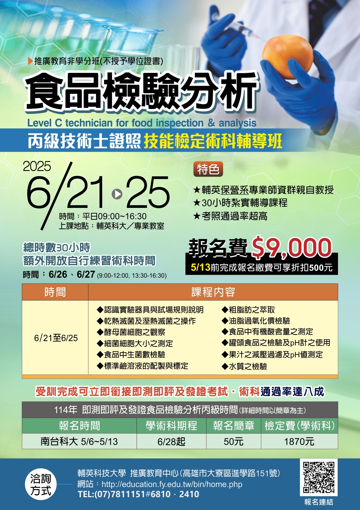 一、輔英科技大學推廣教育中心開設「食品檢驗分析丙級技術士證照技能檢定術科輔導班」,除輔導學生考取食品檢驗分析丙級技術士證照外,亦可協助學生自主學習,達到多元學習之成效。