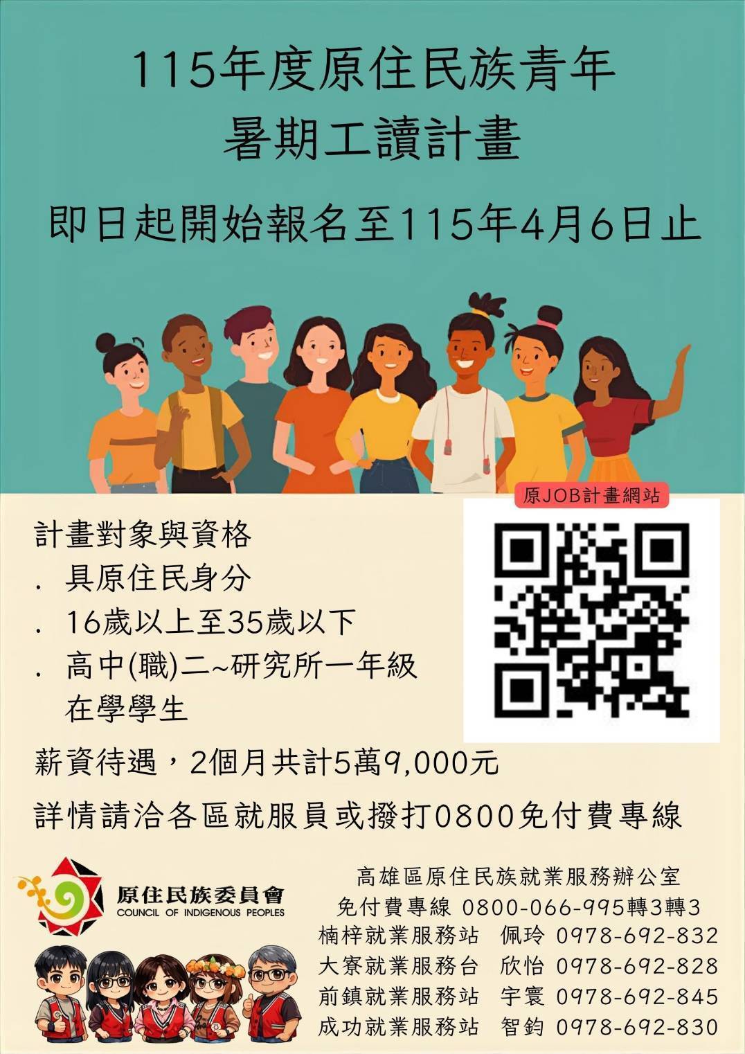 二、採線上報名方式,期間自即日起至115年4月6日止,請至本 會原JOB原住民族人力資源網(https://iwork.cip.gov. tw)「會員登入」申請帳號,進入工讀專區報名,若逾時 則無法使用報名系統。