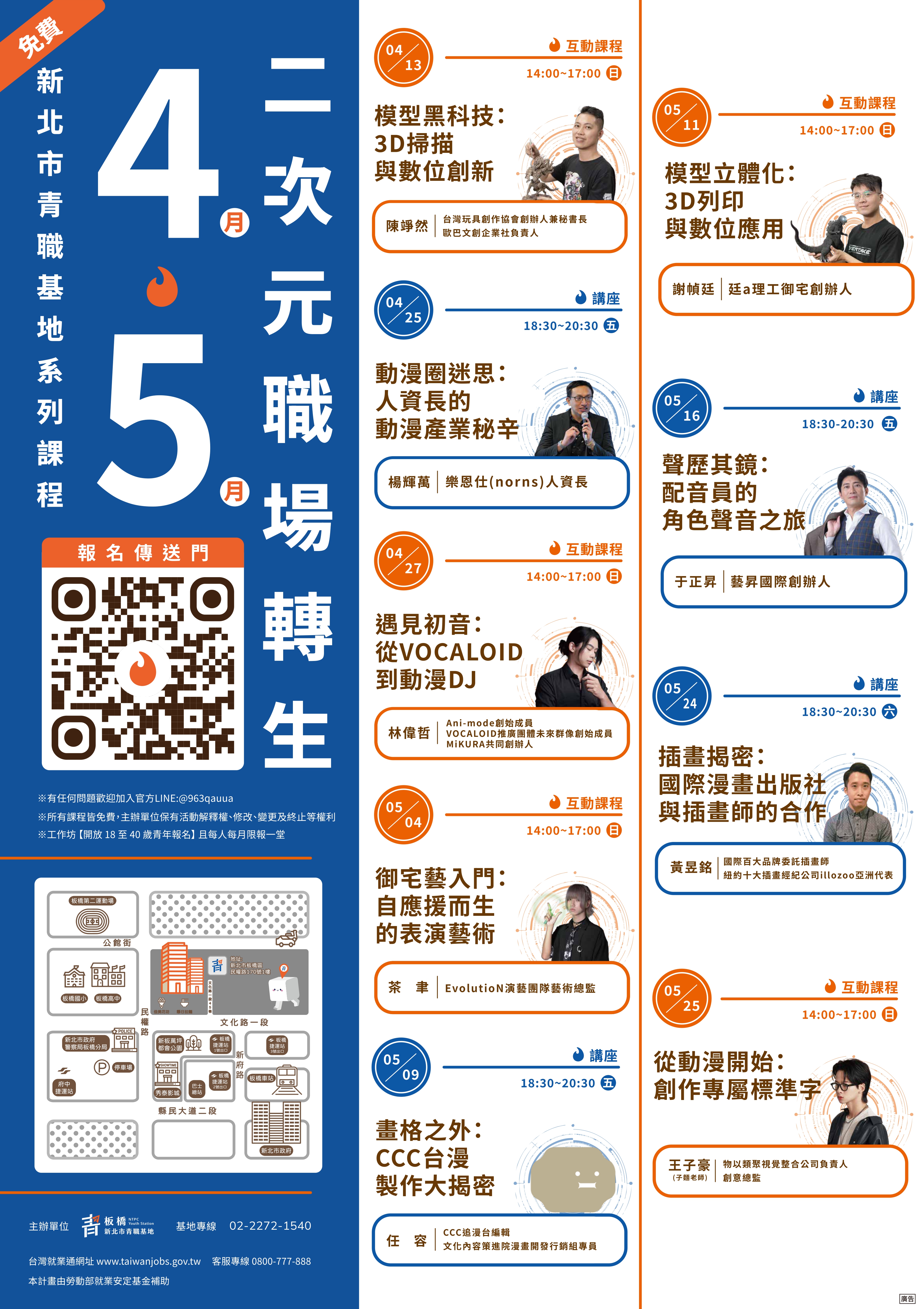 為協助青年對文化產業的認識,拓展多元視野,本局青職基地於 114 年 4~5 月規劃「二次元職場轉生」系列課程,內容涵蓋動漫產業發展、視覺設計、數位內容創作等,透過專題講座與實作課程,提升文化素養與產業理解。