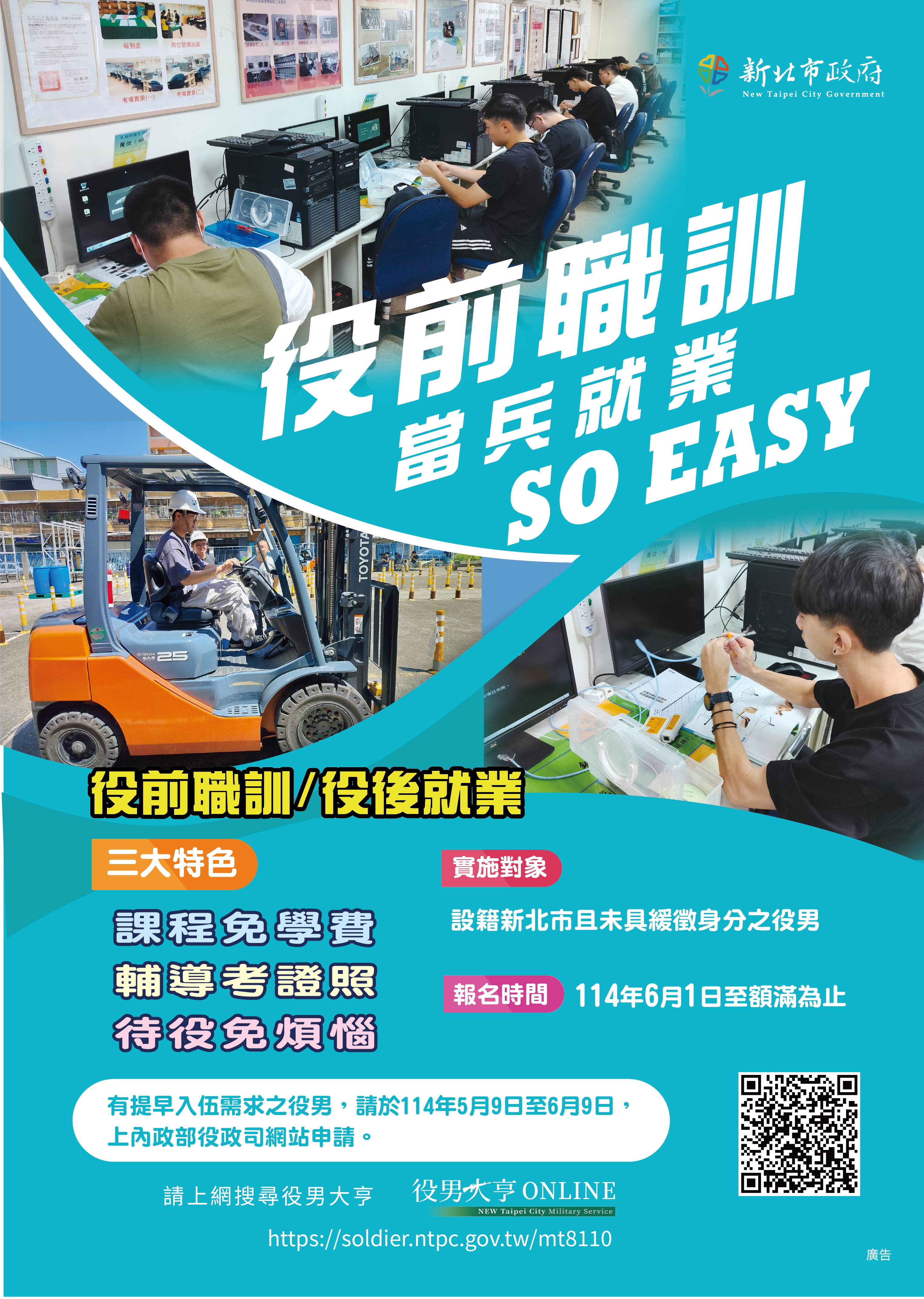 二、役前職能教育訓練計畫,係以未具緩徵身分的待役役男為對象,開設堆高機、AI暨簡報製作、室內電腦繪圖、飲料調製、電腦硬體裝修等證照輔導班,相關課程將於7月至10月間陸續開課,設籍新北市符合資格之役男,可於114年6月1日起至新北市政府民政局役男大亨網頁報名。