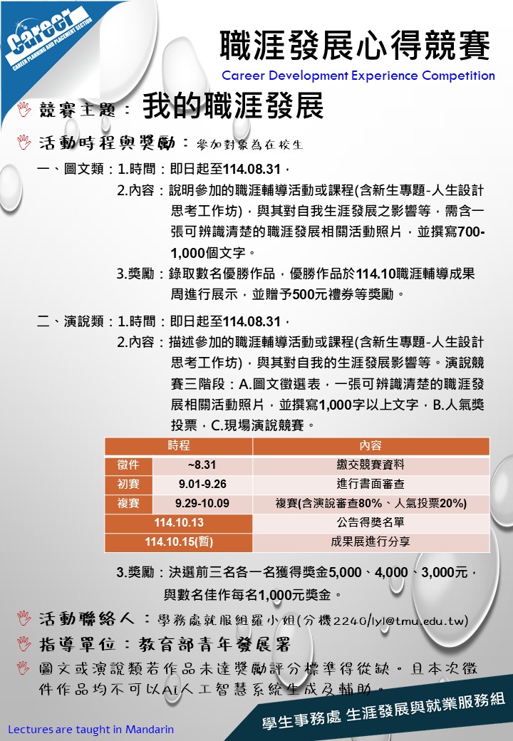 2.內容:描述參加的職涯輔導活動或課程(含新生專題-人生設計思考工作坊),與其對自我的生涯發展影響等。演說競賽三階段:A.圖文徵選表,一張可辨識清楚的職涯發展相關活動照片,並撰寫1,000字以上文字,B.人氣獎投票,C.現場演說競賽。