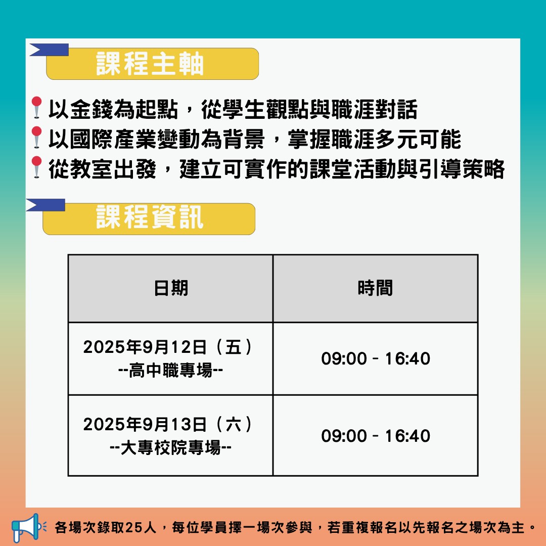 一、本次研習營旨在透過理論與實務並重的課程設計,引導教師掌握將「財務素養」融入職涯發展教育的教學策略。課程內容涵蓋職涯觀點、共通核心職能、理財工具的教學應用,以及關稅政策變化下對就業市場的觀察,並透過互動實作活動協助教師釐清金錢價值觀與職涯決策之間的關聯,進而產出可應用於課堂的教案。藉此強化教師在職涯輔導上的教學實力,協助學生在變動的時代中建立具備財務素養的多元職涯發展能力。
