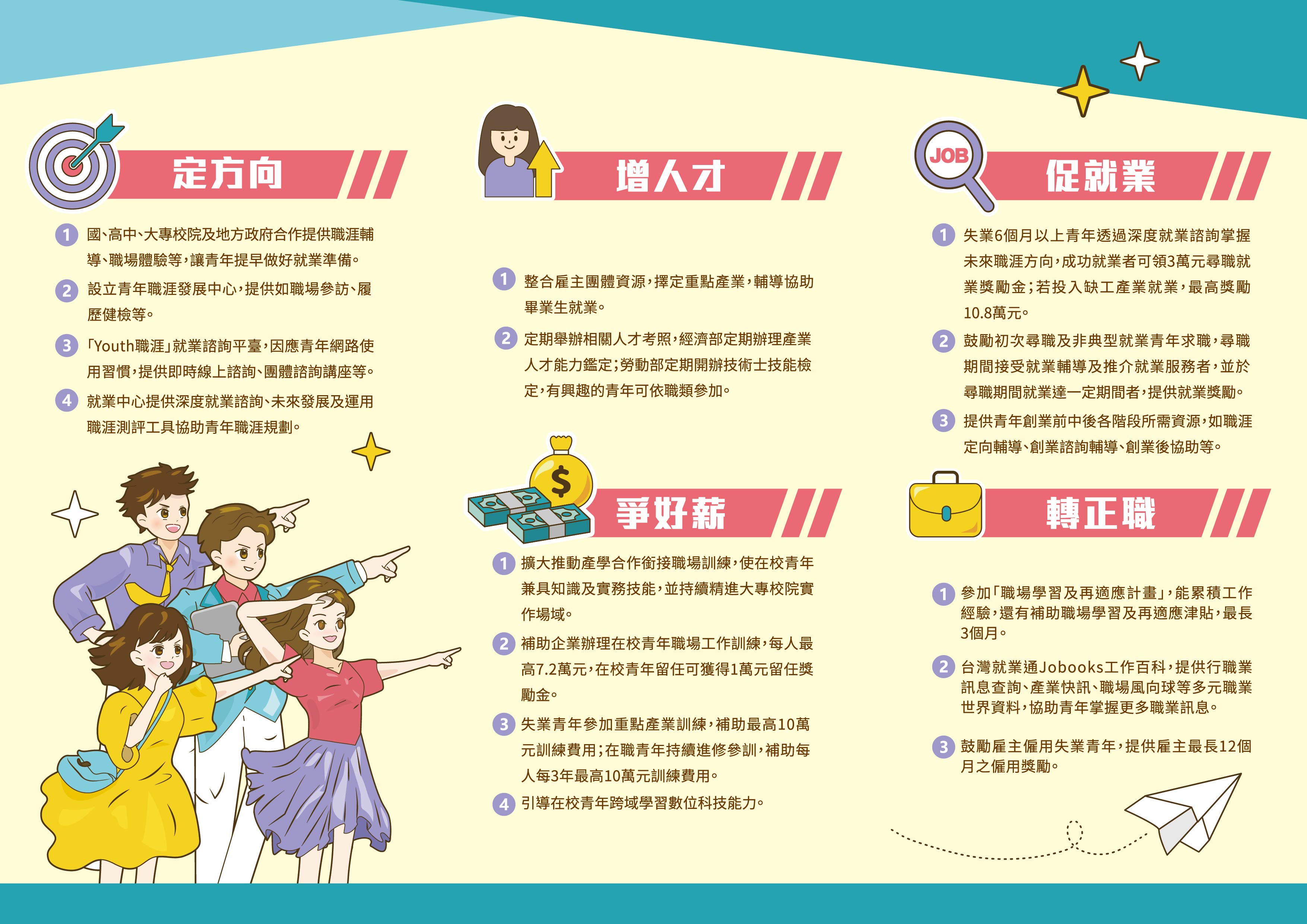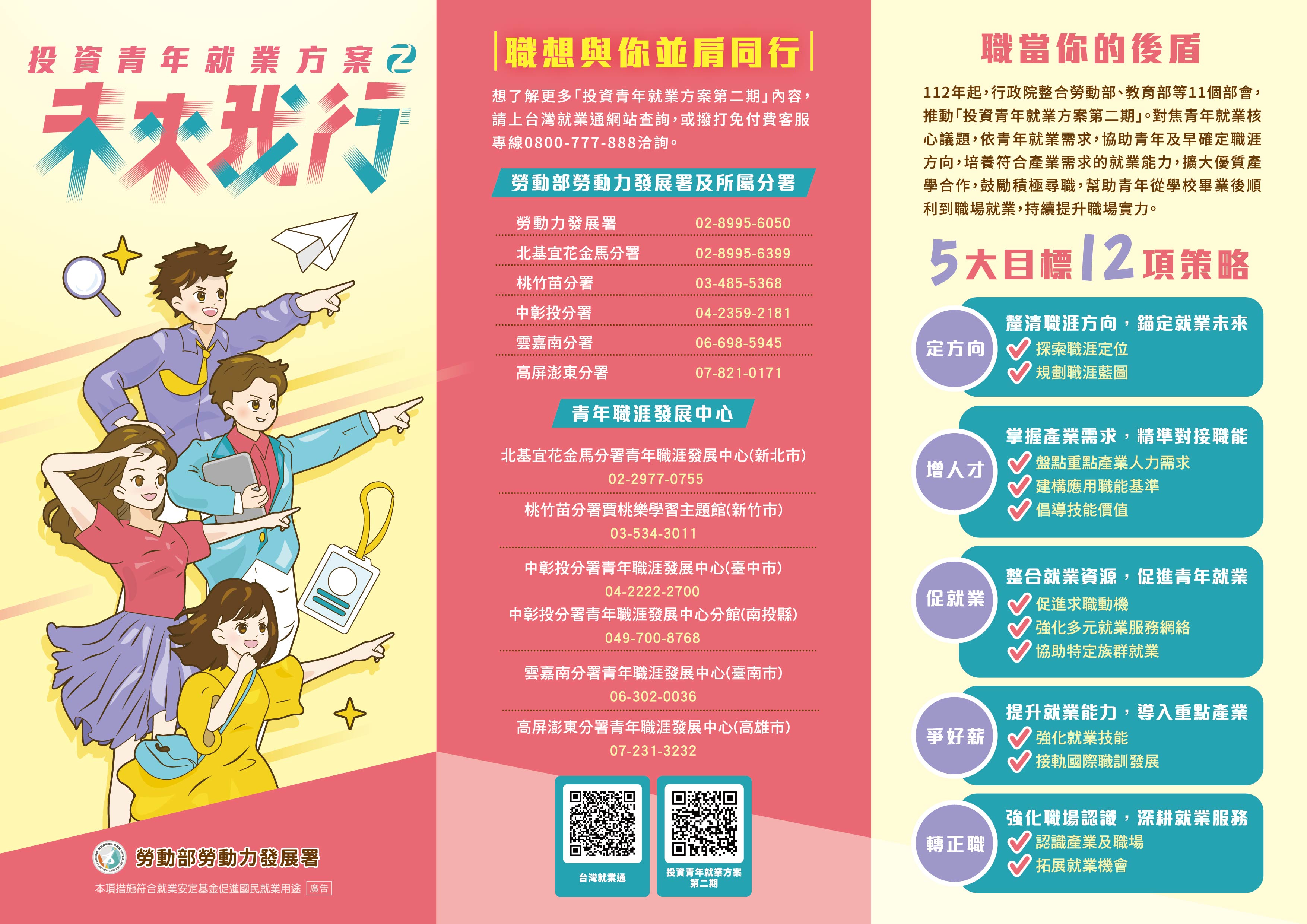 此次提出的第二期方案,掌握產業發展重點,並正視外界關心的「職涯發展」、「人力供需」、「青年失業」、「青年薪資」及「非典型就業」等5項青年就業核心議題,統合11部會資源,提出「定方向、增人才、促就業、爭好薪、轉正職」目標及策略,強化在校職涯引導,擴大優質產學合作,引導跨域學習及數位人才培育,協助非典型青年轉正職,以協助青年順利就業,促進經濟發展與國家競爭力。
