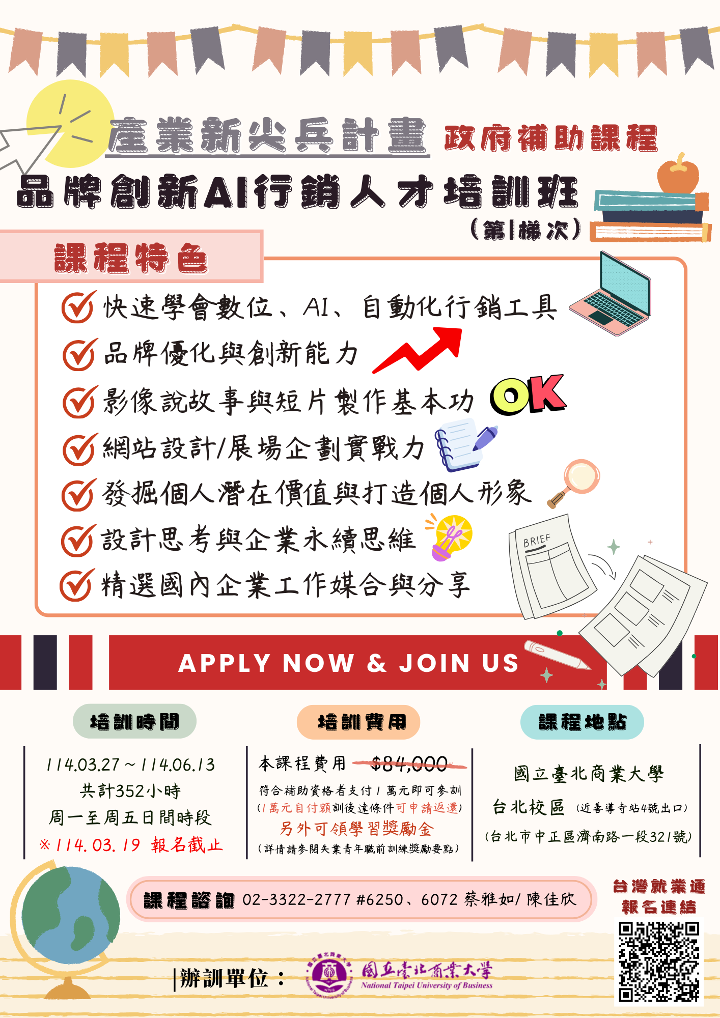一、「品牌創新AI行銷人才培訓班(第1梯次)」課程期間為114.03.27 至 114.06.13,即日起開放報名(114.03.19報名截止),敬請貴單位惠予上網公告並鼓勵有興趣者報名參加。