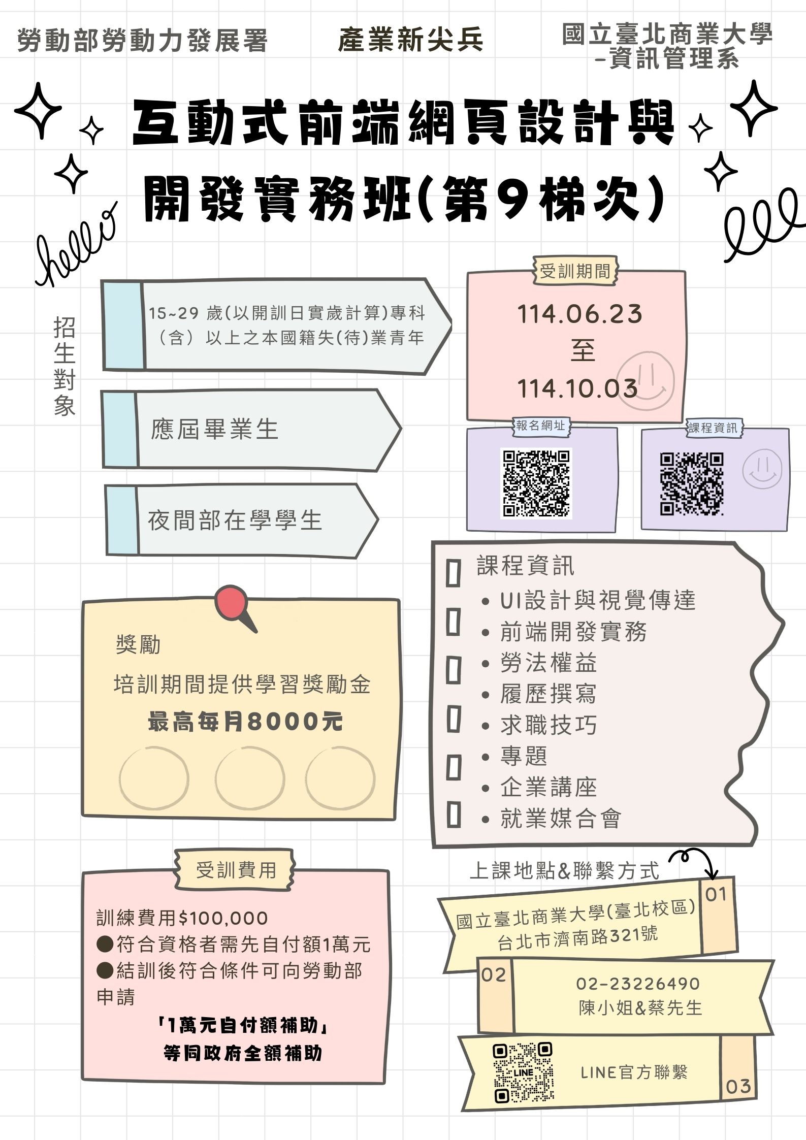 一、國立臺北商業大學資訊管理系商業智慧研究中心承辦勞動部勞動力發展署產業新尖兵計畫,協助勞動部進行失待業青年(含應屆畢業生)職業訓練,培養跨領域專長,透過職業訓練課程輔導就業協助轉職。