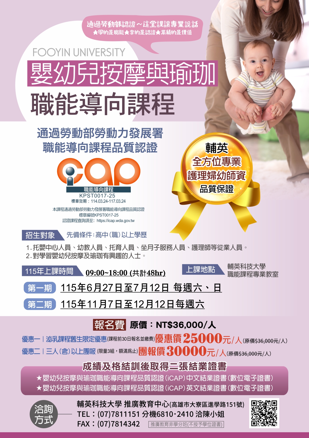 一、「嬰幼兒按摩與瑜珈」結業證書:成績及格結訓後可取得二張檢定合格證書。