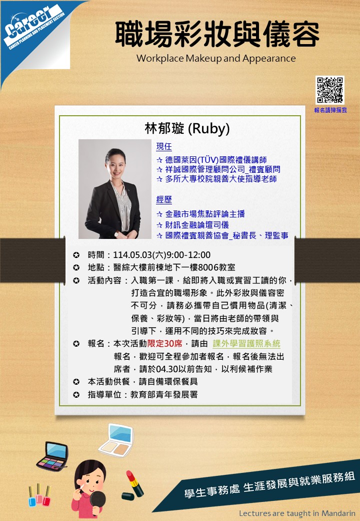 µ活動內容:入職第一課,給即將入職或實習工讀的你, 打造合宜的職場形象。此外彩妝與儀容密