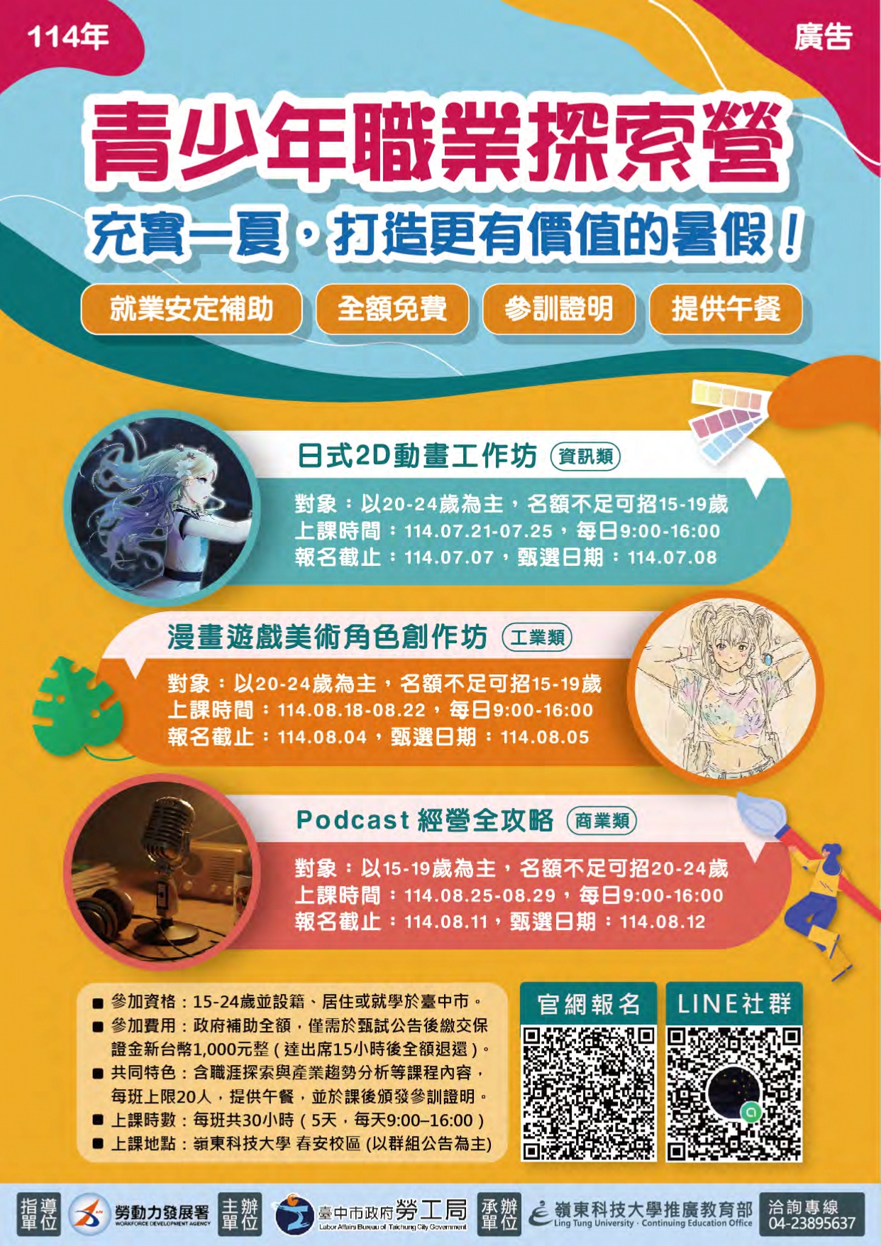 嶺東科技大學辦理114年度臺中市政府勞工局青少年職業探索營-「日式2D動畫工作坊(資訊類)」、「漫畫遊戲美術角色創作坊(工業類)」與「Podcast經營全攻略(商業類)」招生簡章。