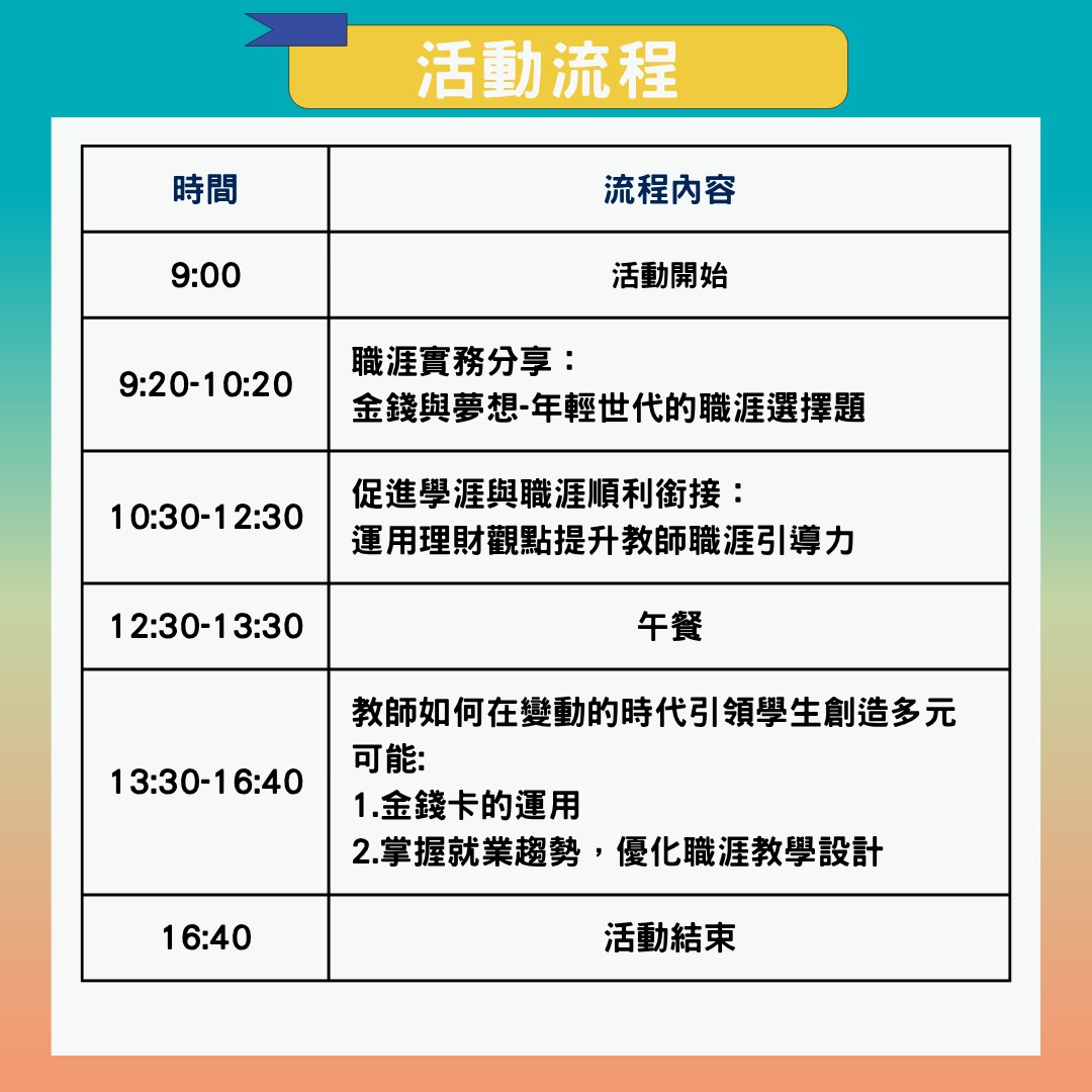 一、本次研習營旨在透過理論與實務並重的課程設計,引導教師掌握將「財務素養」融入職涯發展教育的教學策略。課程內容涵蓋職涯觀點、共通核心職能、理財工具的教學應用,以及關稅政策變化下對就業市場的觀察,並透過互動實作活動協助教師釐清金錢價值觀與職涯決策之間的關聯,進而產出可應用於課堂的教案。藉此強化教師在職涯輔導上的教學實力,協助學生在變動的時代中建立具備財務素養的多元職涯發展能力。
