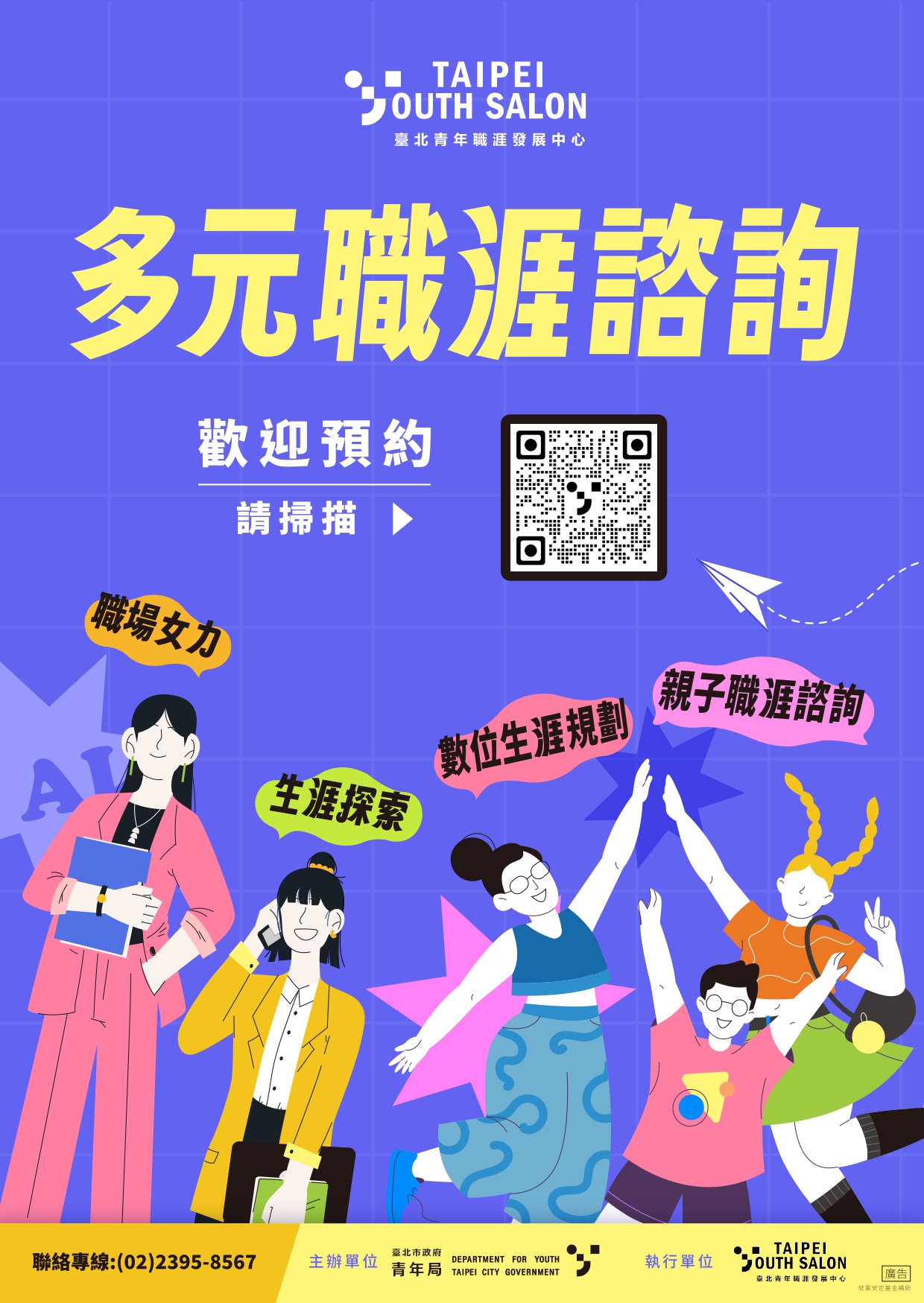 一、為促進青年職涯發展,臺北市政府青年局臺北青年職涯發展中心提供職涯諮詢服務,並就「親子職涯溝通」、「數位生涯規劃」及「女性職涯發展」三大主題,提供專屬職涯探索與發展服務。