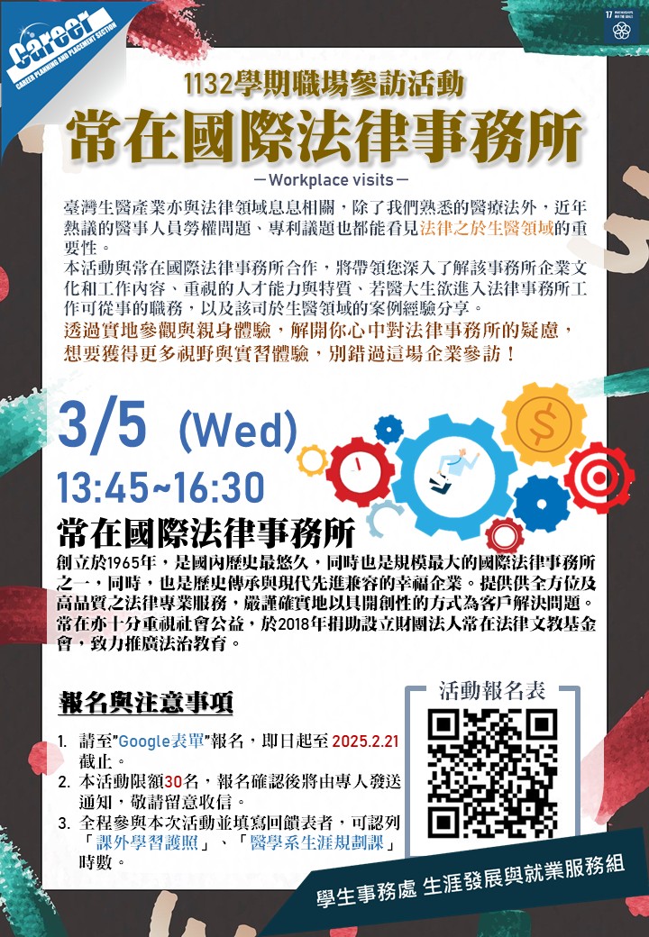 本活動與常在國際法律事務所合作,將帶領您深入了解該事務所企業文化和工作內容、重視的人才能力與特質、若醫大生欲進入法律事務所工作可從事的職務,以及該司於生醫領域的案例經驗分享。