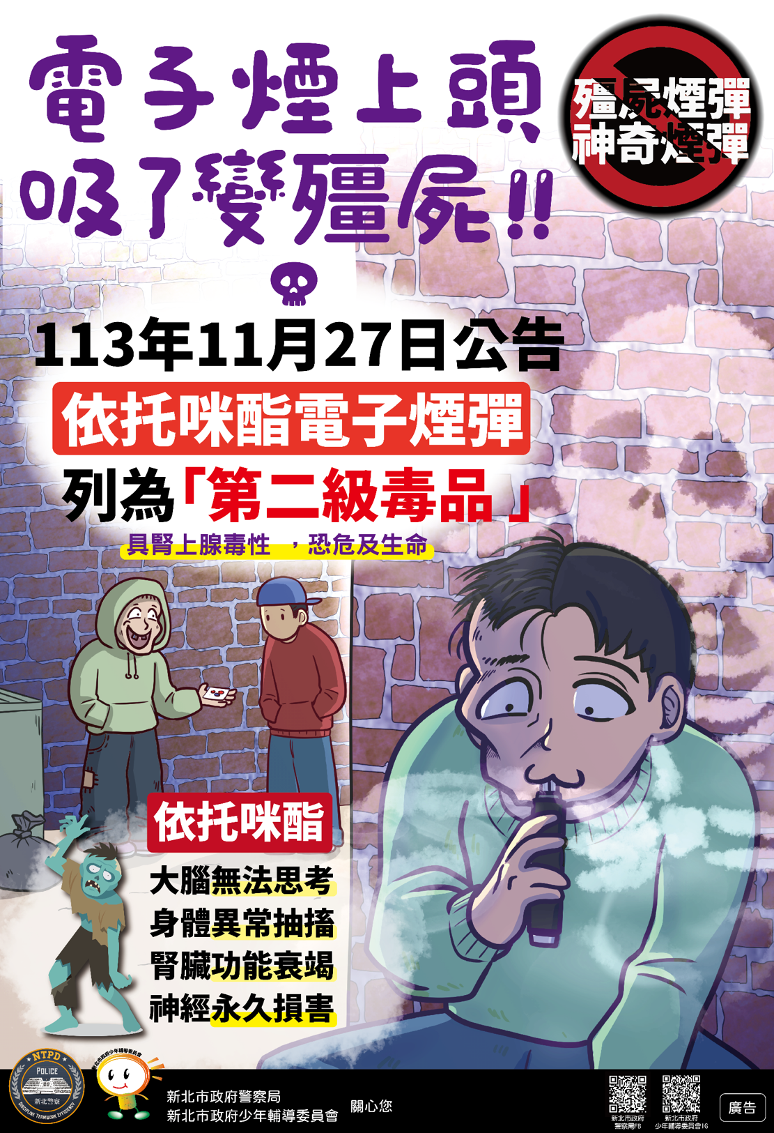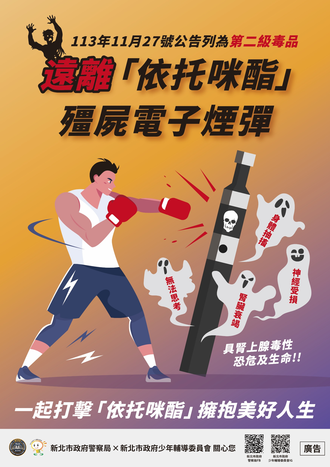 行政院於113年11月27日公告依托咪酯及其異構物等(美托咪酯、異丙帕酯)為第二級毒品,為提醒依托咪酯對人體健康所造成危害,並防範該毒品進入校園,警察局印製2款反毒宣導海報(如附檔),請大家一起拒絕毒品。