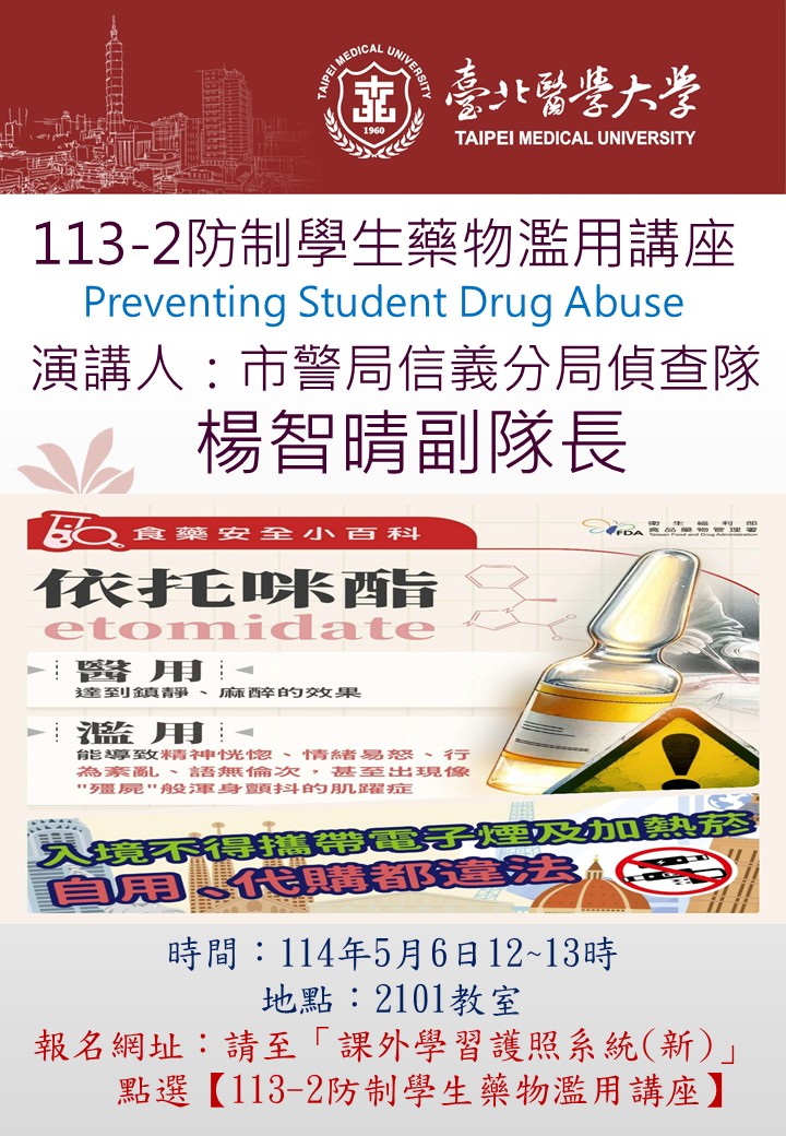 一、113-2防制學生藥物濫用-專題講座活動,預定於114年5月6日中午12時至13時舉行,地點:2101教室,講師:信義分局楊智晴警官。